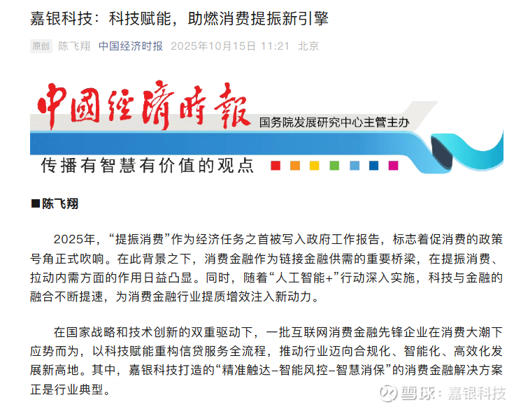 10月15日,由国务院发展研究中心主管、主办的《中国经济时报》发布文章《嘉银科技:科技赋能,助燃消费提振新引擎》,介绍了以嘉银科技为代表的互联网消费金融先锋企业,以科技赋能重构数字信贷全流程,为提振消费、释放内需潜力提供重要引擎。