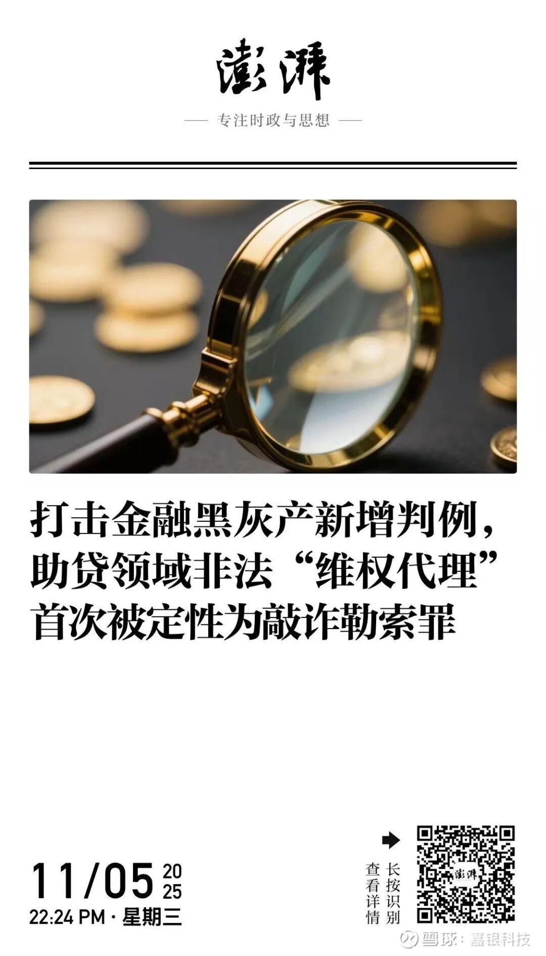 11月5日,澎湃新闻发布文章《打击金融黑灰产新增判例,助贷领域非法“维权代理”首次被定性为敲诈勒索罪》,文章阐述嘉银科技助力上海警方侦破金融黑灰产案件,长宁区人民法院已于近期开庭审理并宣判该案,首次将涉及助贷行业的非法代理维权组织“维权代理”行为定性为敲诈勒索罪。