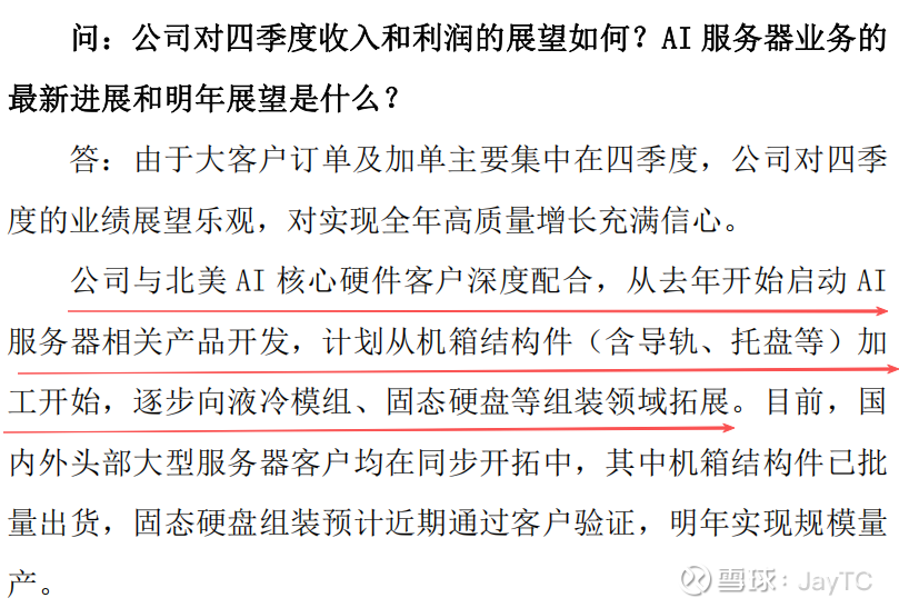 ➠服务器:从导轨/托盘等结构件环节导入,26年有望逐步向液冷模组、固态硬盘等组装领域拓展,空间广阔。