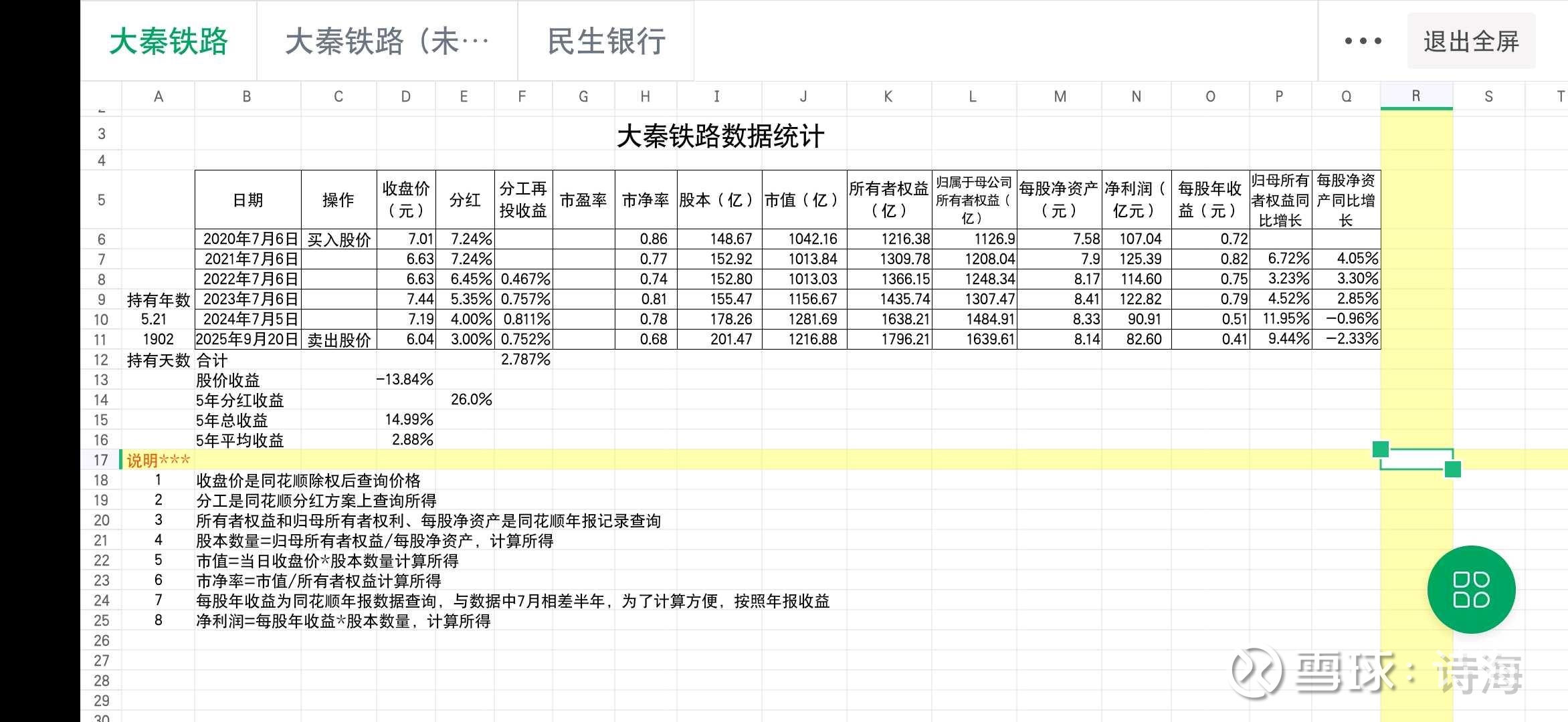 $大秦铁路(SH601006)$ 大秦铁路从2020年7月6日买入,2025年9月20日卖出,持股5.21年,计1902天,总收益14.99%,年平均收益2.88%。说好的高股息呢?可能并非你所想象。