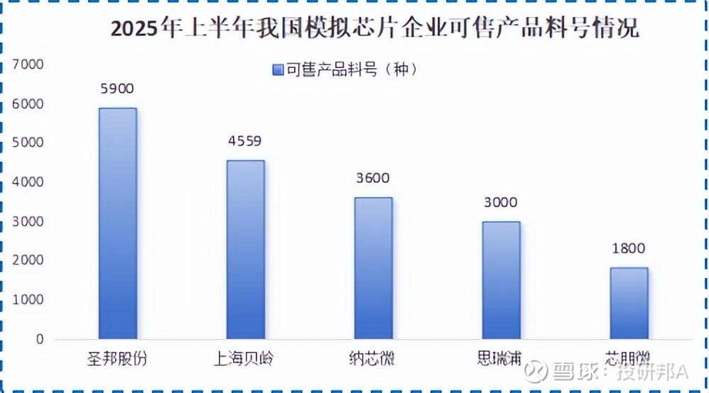 截至2025年6月底,圣邦股份产品涵盖34大类,有5900多种产品可供销售。圣邦产品种类数量远高于上海贝岭的4559种、纳芯微的约3600种,达到断层第一。