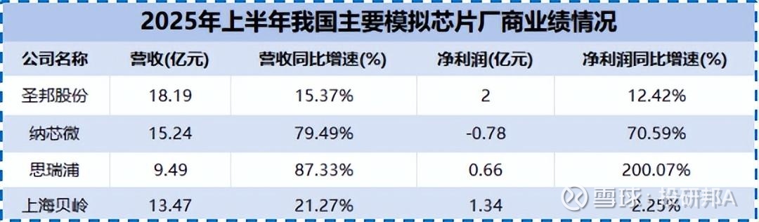 2025年上半年,纳芯微营收、净利润同比实现高双位数增长;思瑞浦净利润同比增速更是高达200.07%,比圣邦股份、上海贝岭高出不少。