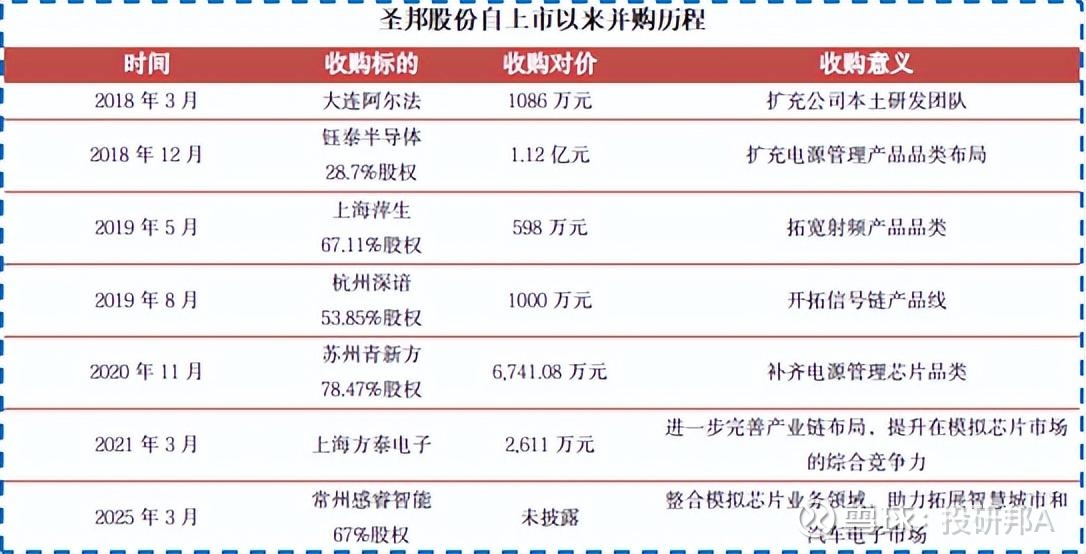 近年来,圣邦股份豪掷1.12亿收购钰泰半导体,扩充电源管理产品品类;收购杭州深谙,形成“电源管理+信号链芯片”双轮驱动的业务格局。
