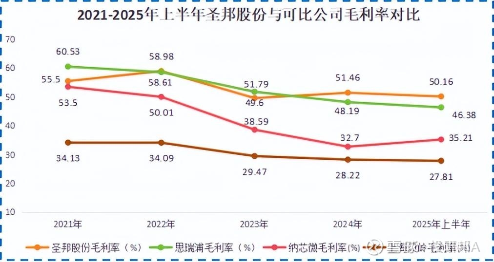 不过,受主营业务电源管理产品竞争加剧、价格下降影响,2025年上半年圣邦股份毛利率还是较去年同期下滑2.17个百分点。