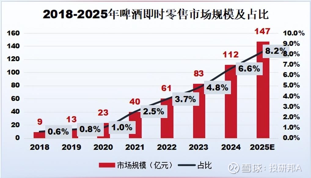 预计2025年啤酒即时零售的市场规模将达到147亿元,占比接近全渠道的10%,未来有可能会成为啤酒销售渠道新势力。