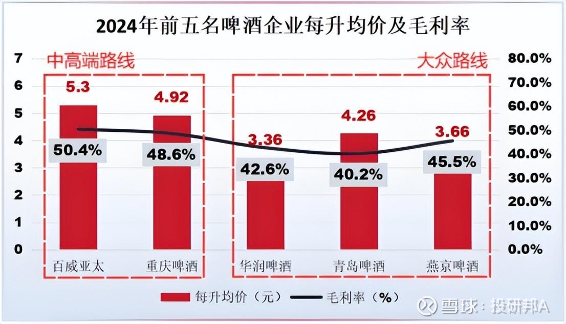 重庆啤酒作为另一个外资高端品牌,2024年的每升均价为4.92元,毛利率为48.6%,仅次于百威亚太。