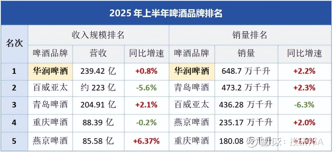 2025年上半年,国内啤酒市场经历了一次大地震,华润啤酒以半年收入239.42亿元、销量648.7万千升的好成绩,首次超越百威亚太成为中国啤酒品牌第一名。
