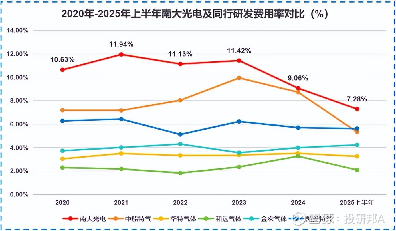 毕竟,南大光电的研发强度对比同行实在不低。2020年-2024年,公司研发费用率基本在10%及以上的水平,远高于中船特气、华特气体等同行。