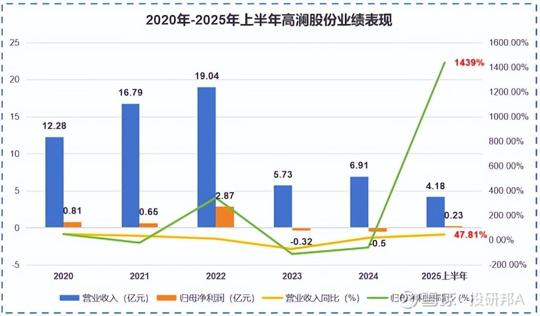 2025年上半年,高澜股份实现营收4.18亿,同比增长47.81%;实现净利润0.23亿,同比大增1439%,业绩直接扭亏为盈。