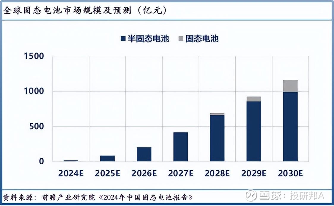 2024年全球固态电池市场规模大约60亿元,并且以半固态电池为主,预计到2030年市场规模将突破1200亿元,并且主要为全固态电池,期间年复合增速高达65%。