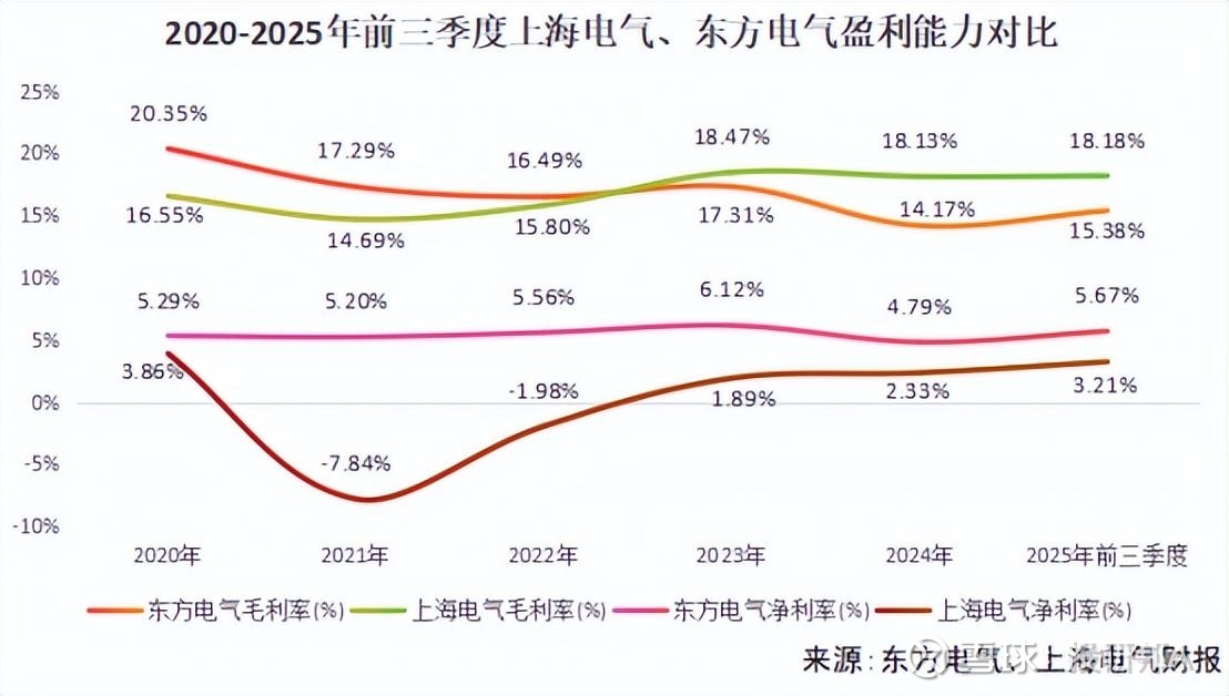 相对来说,上海电气毛利率更为稳定。2023-2025年前三季度,上海电气毛利率一直维持在18%以上,不过其净利率始终落后于东方电气。