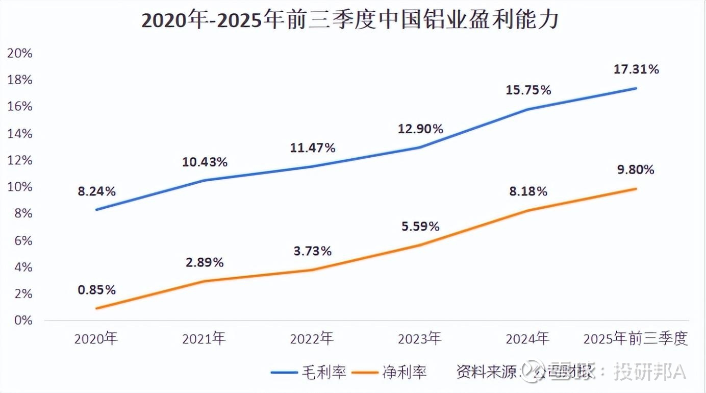 数据最具说服力,2020年中国铝业毛利率仅7.64%,低于天山铝业(13.67%)、南山铝业(23.72%)等同行,而2025年前三季度,中国铝业毛利率升至17.31%,与同行差距明显减小;