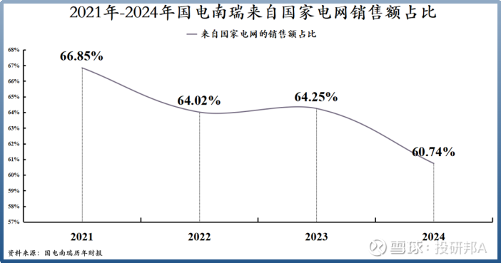 国电南瑞正在通过开拓国网公司系统外业务以及海外市场来优化业务结构。2021-2024年,其来自国家电网的销售额占比从66.85%下滑到60.74%。