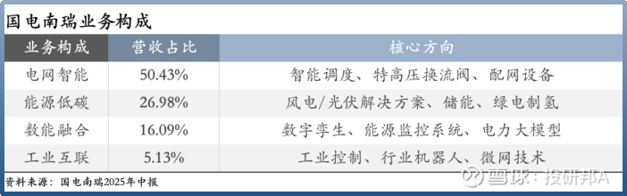 用公司自己的话,其拥有电网智能、能源低碳、数能融合三大业务支柱,2025年上半年营收占比分别为50.43%、26.98%和16.09%。