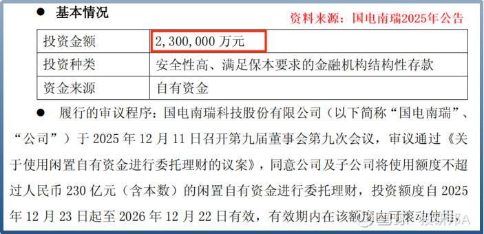 2025年底,国电南瑞表示将用不超过230亿元现金进行理财,为期一年,可滚动使用。