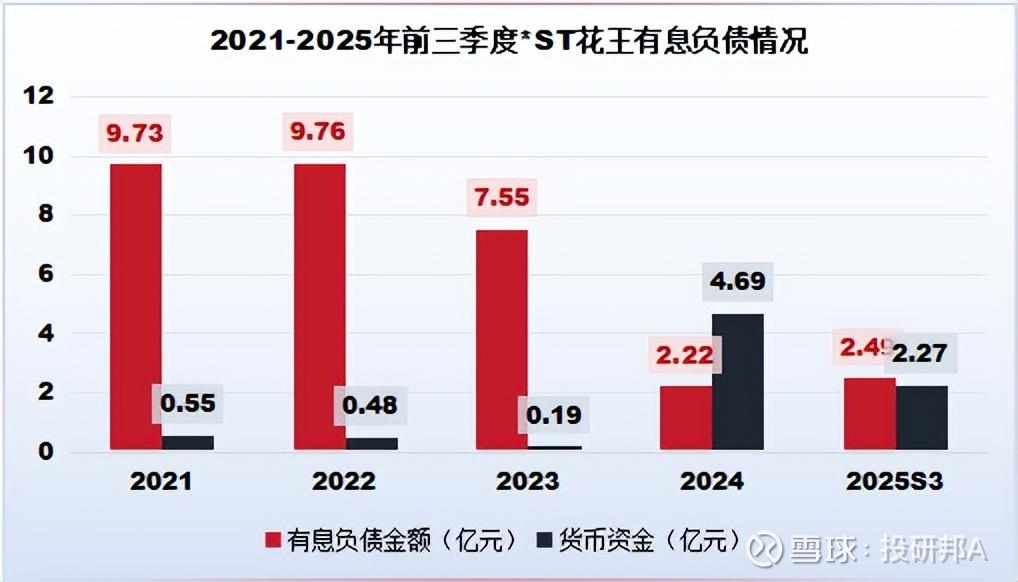 债务压力方面,截至2025年三季度末,*ST花王仍有2.49亿元的有息负债需要偿还,而同期公司货币资金只有2.27亿元,资金缺口为0.22亿元。
