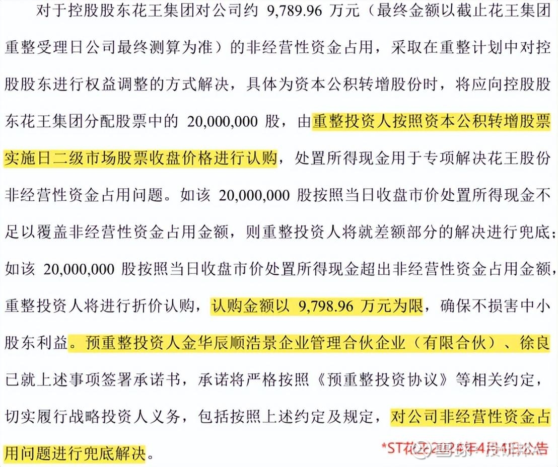 具体内容是公司原实控人花王集团进行重整,*ST花王应该分配给股东的200万股,由引进的重整投资人辰顺皓景、徐良进行兜底收购,处置所得现金用于专项解决*ST花王的非经营性资金占用问题。