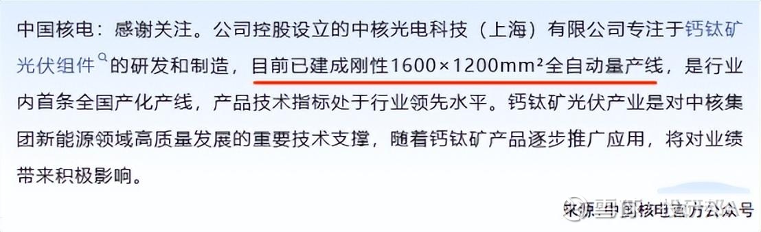 值得一提的是,中国核电控股设立的中核光电科技专注钙钛矿光伏组件的研发制造,目前已建成1600×1200mm²全自动量产线,是行业内首条全国产化产线。