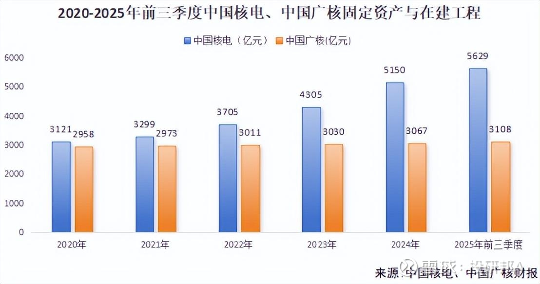 截至2025年第三季度末,中国核电总资产达到7207亿元,高出中国广核的4471亿元一大截,几乎都差在了固定资产与在建工程上。