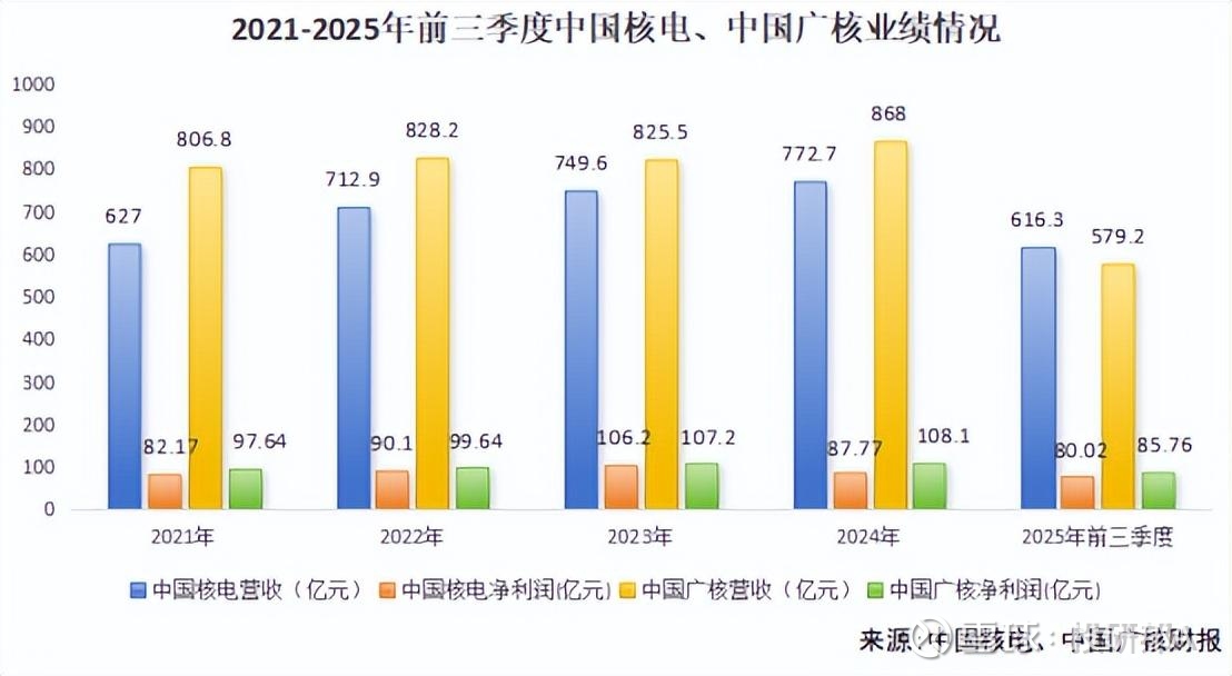 2025年前三季度,中国核电实现营收616.3亿元、净利润80亿元,中国广核营收、净利润分别为579.2亿元、85.76亿元。
