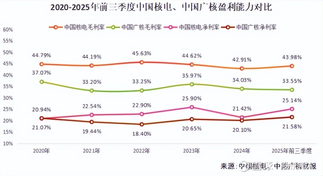 2020-2025年前三季度,中国核电毛利率维持在42%以上,中国广核则是在34%上下浮动。