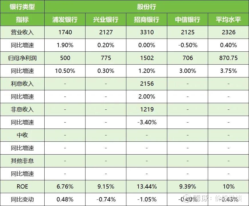 从股份行角度来看,平均营收增速仅有0.4%,最高的浦发银行为1.9%,最低的中信银行负增长0.5%。营收增速较低反映的是目前市场对金融需求的低迷。平均归母净利润增速3.75%,最高的仍是浦发银行为10.5%,最低的兴业银行为0.3%。