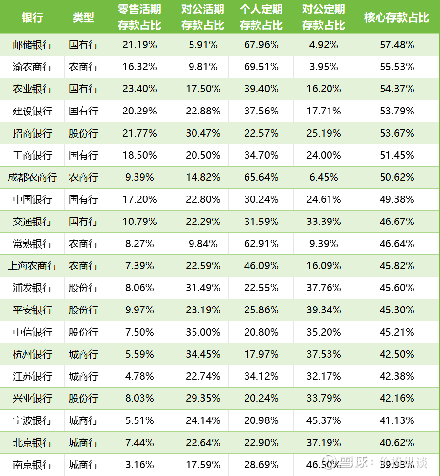 核心存款=零售活期90%+对公活期50% + 个人定期50% + 对公定期30%