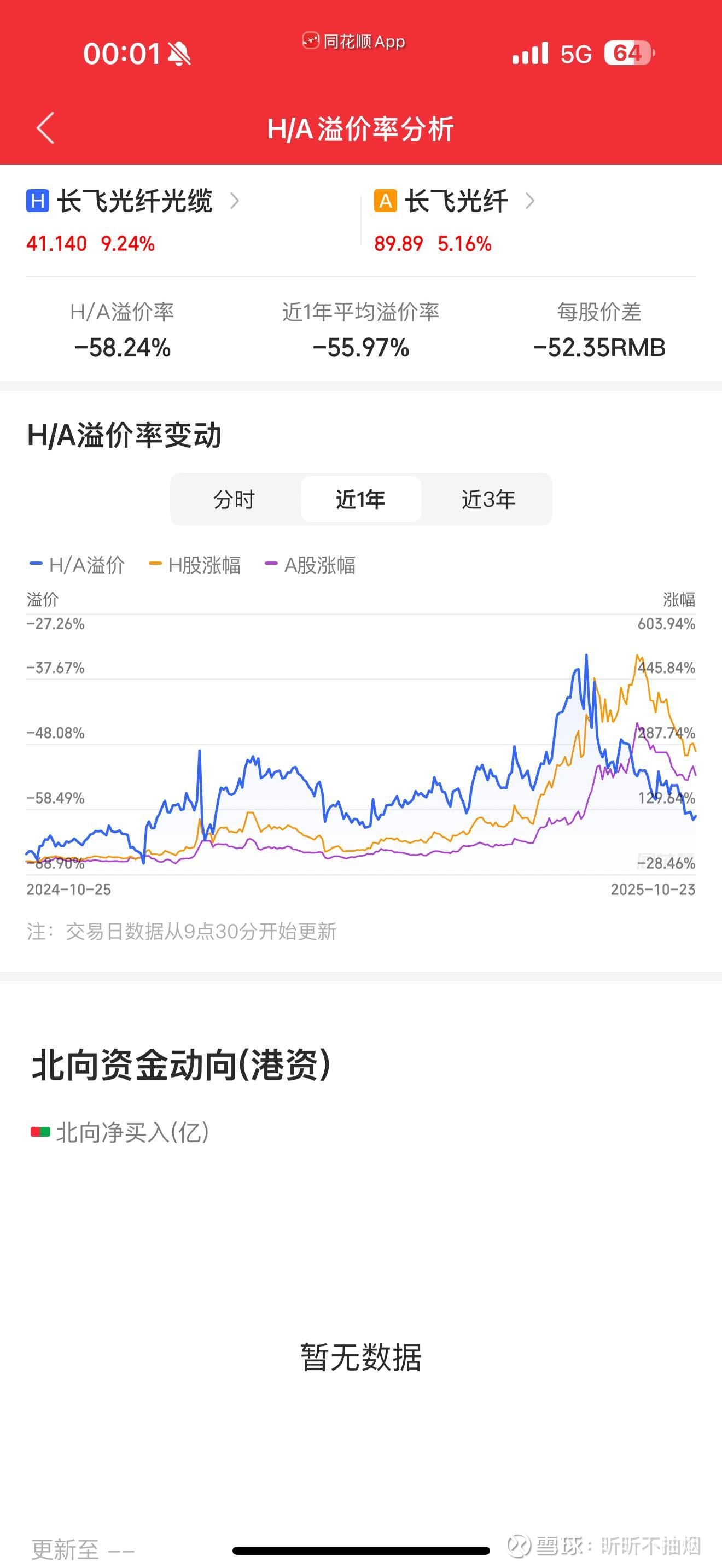 关于港股和A股溢价率,不同行业没办法比较,目前已有A+H股中,长飞光纤算是行业相对最靠拢,A股市值都是300多亿的,下面是近一年长飞光纤和港股长飞光纤线缆(HK6869)的溢价率,近一年平均溢价率-55.97%,最新(2025年10月24号溢价率-58.25%)大A股价89.89,H股股价41.14港币(对应41.14*0.9166=37.71元rmb)