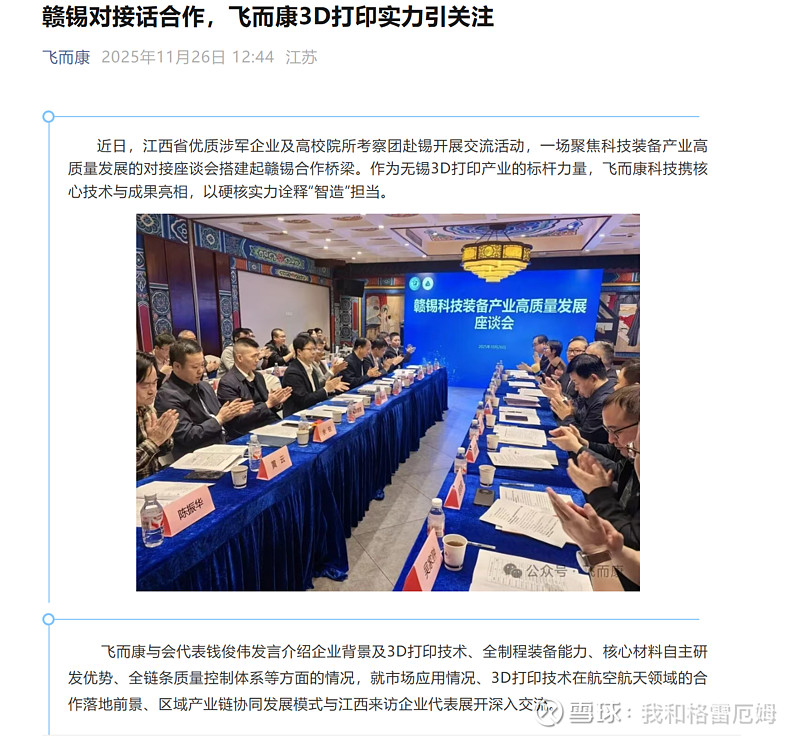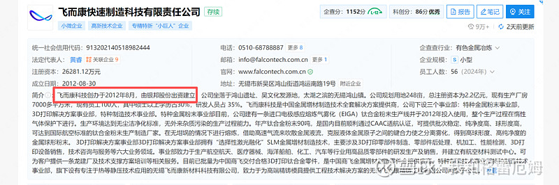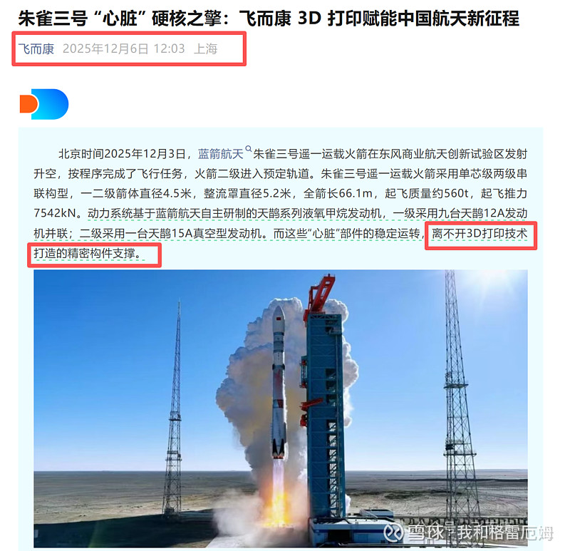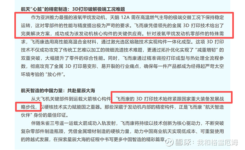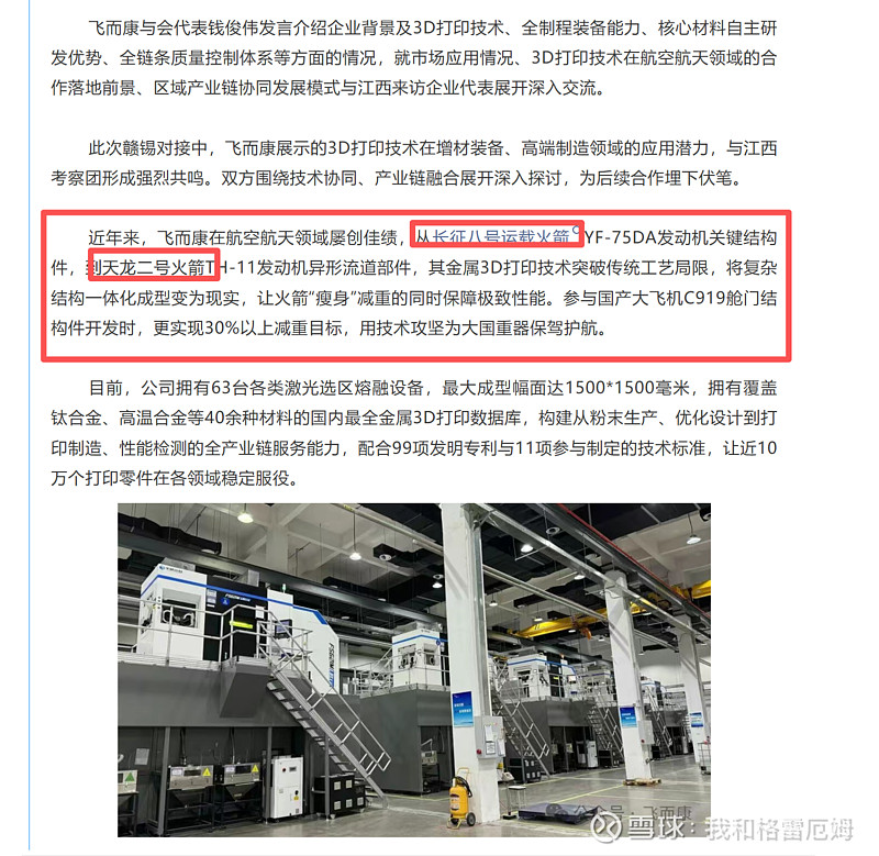 1)国内航空航天部件3D打印头部公司是-无锡飞而康,飞而康是银邦股份投资设立的公司,后来因为要钱发展,引入无锡产发(无锡国资)和社会化资本,因此目前看无锡产发是大股东,但后续银邦增资或置入成为大股东可能性较大,毕竟国资不是以谋求控制权为主,更多的是投资人角色。 飞而康给蓝箭航天、长征八以及一系列民营火箭和卫星公司,都供应核心部件!(见上图)