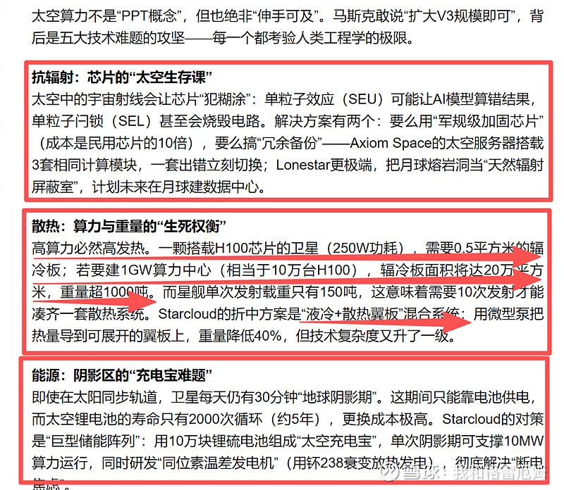 2)未来太空算力中心3大难题,第一是抗辐射,第二是散热(虽然太空超低温,但是真空环境,需要金属导热,无法实现内部空气流动),第三是太阳能板能源(这个讲$乾照光电(SZ300102)$ 讲了无数次了)!(见下图)