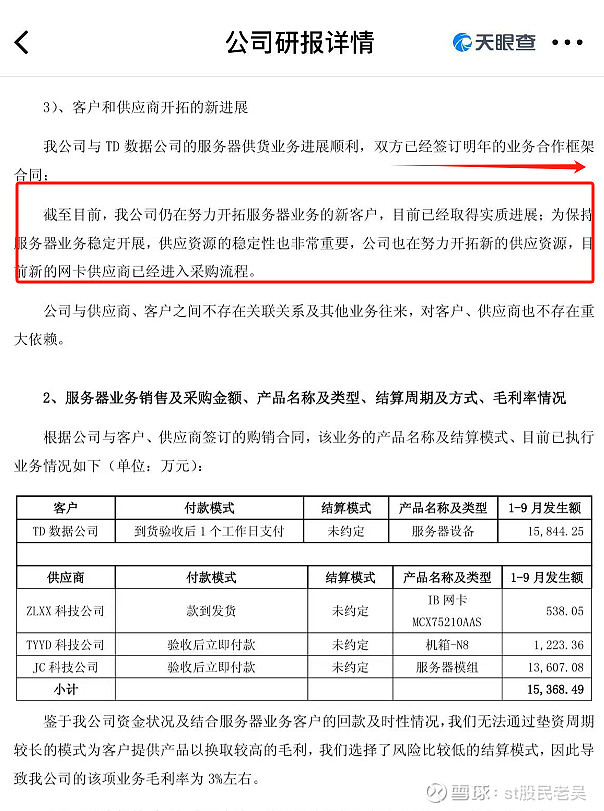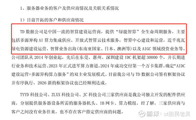 利好的消息是:其一,交易所下发的是问询函,他的2.3亿服务器订单是TD数据公司,老吴肯定的是深圳的天顿数据科技有限公司,因为天顿数据,跟公告说的公司简介是一模一样的,其中还有三家供应商有TYYD科技公司,ZLXX科技公司,JC科技公司。