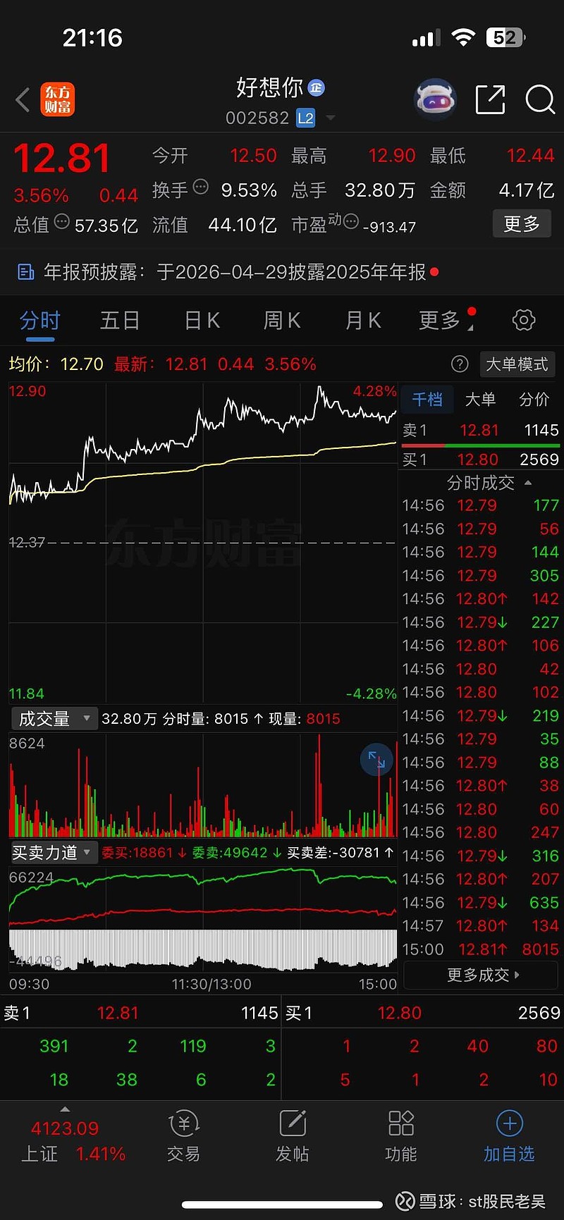 $好想你(SZ002582)$ 情人节概念股,好想你,2月14日,可潜伏,等人抬轿,没人的话估计也亏不了多少,现价12.81,会不会拉到13.14去呢,纯玄学。今天分时图走的可以。一浪高过一浪,之前情人节还炒过星期六,现在他改名叫$遥望科技(SZ002291)$ 了,可关注,仅供参考