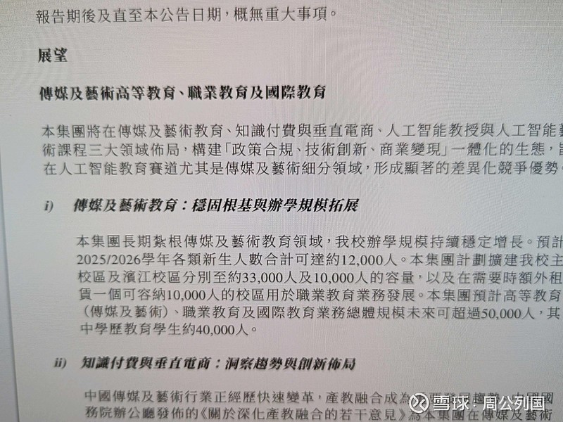 3、“本集团近期与中国知名人工智能企业独家合作,并计划于2025年下半年推出传媒及艺术领域(人工智能教授与人工智能艺术课程)订阅制产品。”与人工智能公司合作到底能带来多少回报?说心里话,估计谁也不好预测。但有一点儿是确定的,锯响就有沫!如果有超额回报,那就更好,没有也不影响大局。