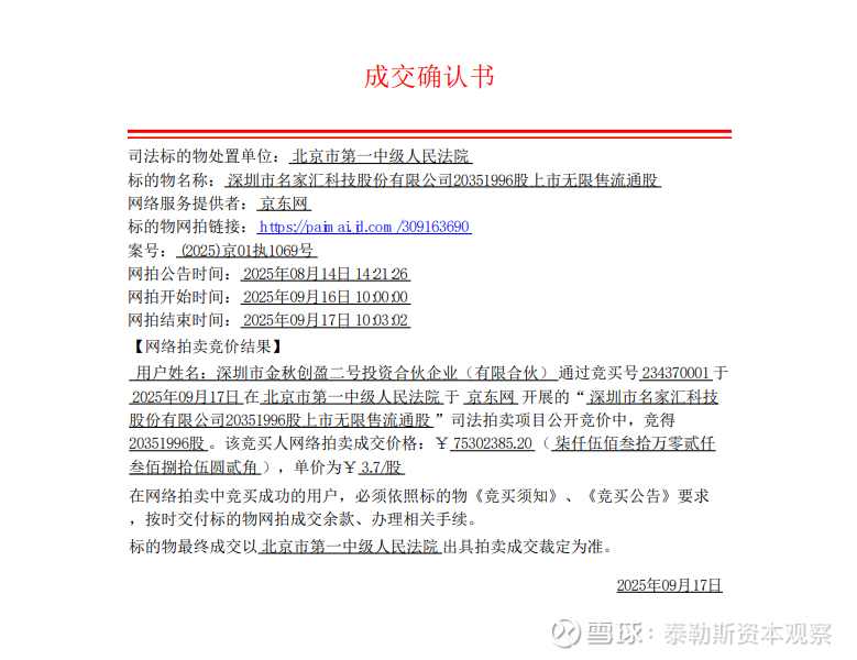2025年9月17日ST名家汇(S300506)控股股东程宗玉持有的深圳市名家汇科技股份有限公司20351996股,在京东拍卖,起拍价3.7元,经过竞拍,竞拍人:深圳市金秋创盈二号投资合伙企业(有限合伙)最终以3.7元价成交。