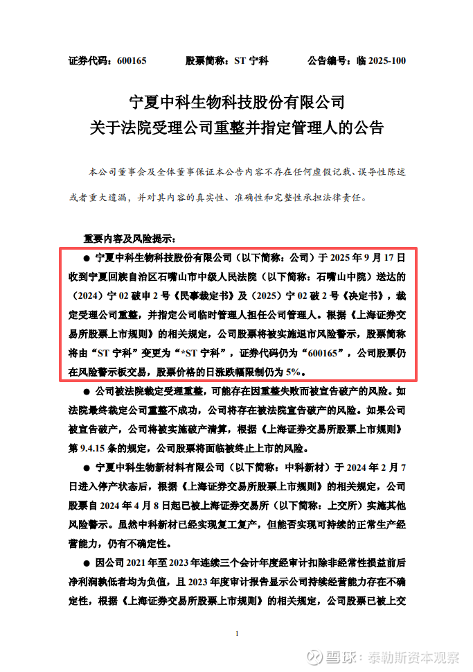 2025年9月17日,ST宁科(SH600165)发布《关于法院受理公司重整并指定管理人的公告》,主要内容如下: