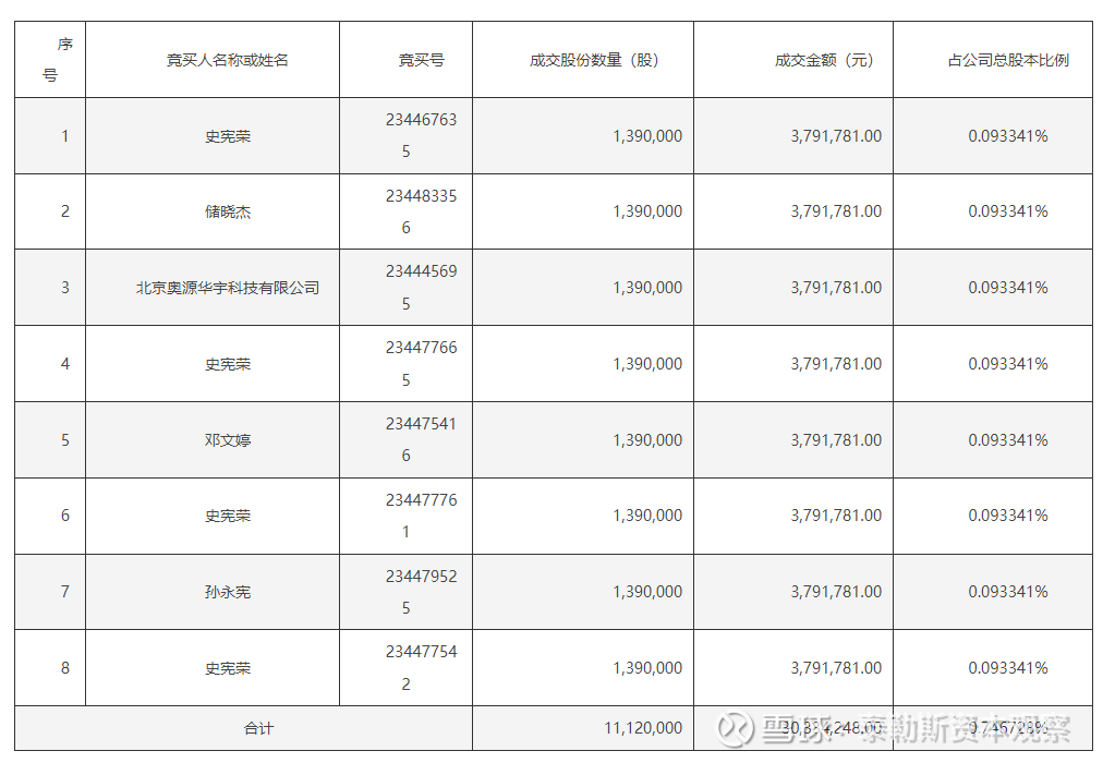 根据京东网络司法拍卖平台 2025 年 9 月 30 日公示的《成交确认书》,季伟持有的 11,120,000 股公司股份(占其持有公司股份总数 60,894,805 股的 18.2610%,占公司总股本的 0.7467%)被竞买人竞得,简单数学计算,本次拍卖成交价 2.73元/股,具体情况如下: