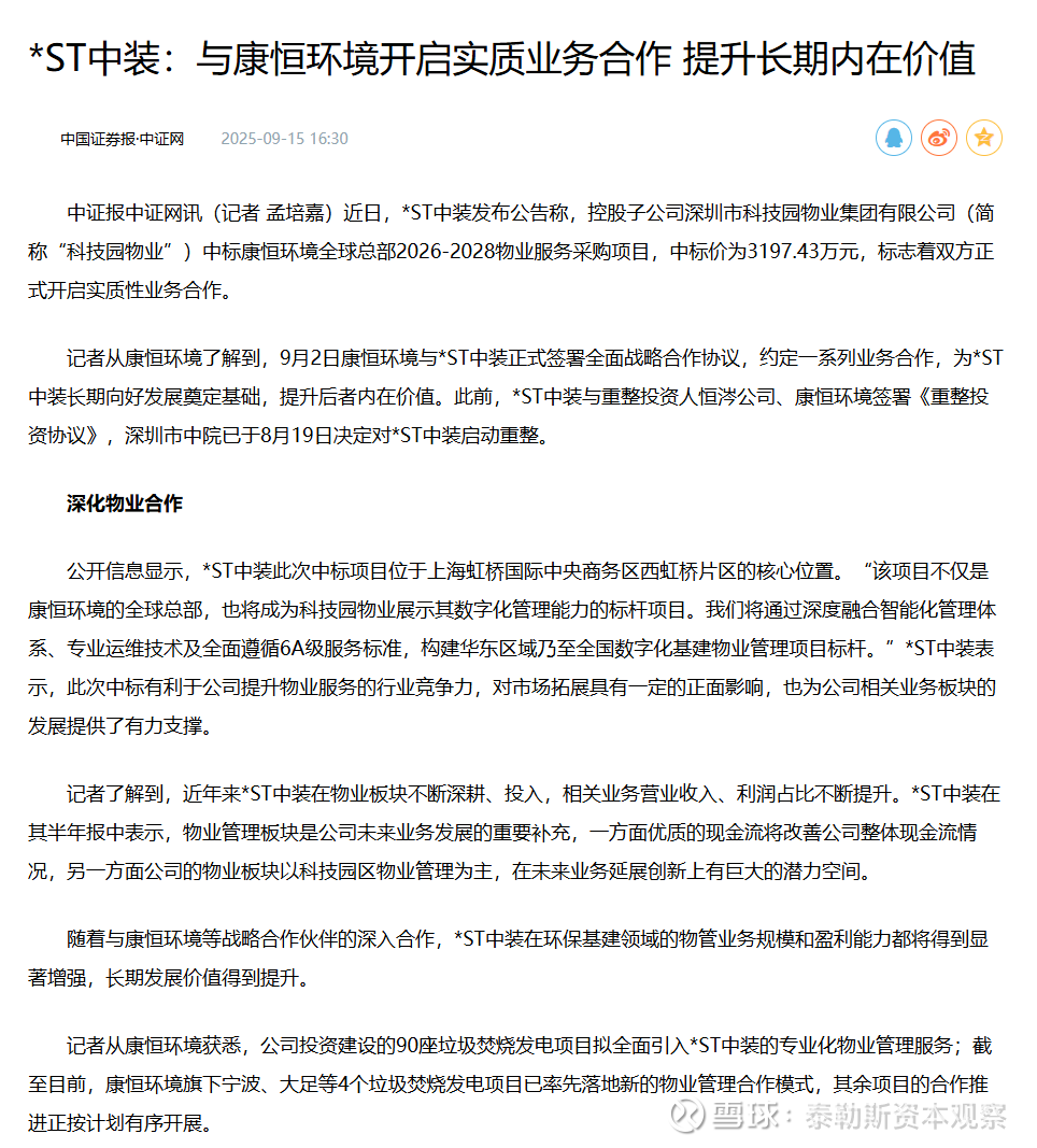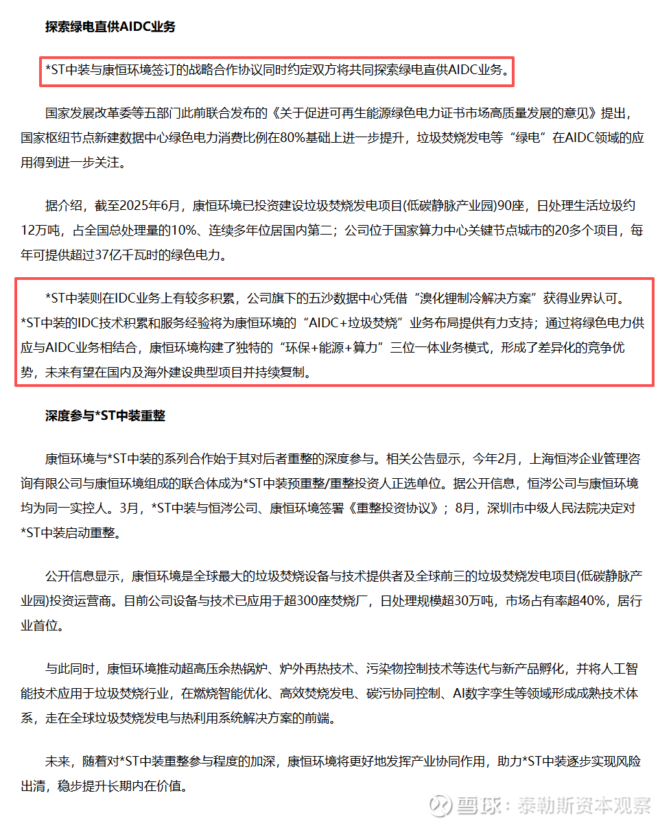 【泰勒斯资本按】官媒中国证券报9月15日发表《*ST中装:与康恒环境开启实质业务合作 提升长期内在价值》,提到*ST中装(SZ002822)与康恒环境签署战略协议,但*ST中装并未发布公告。可能的原因是,战略协议不具约束力,未达到上市公司信披要求。本文提到物业合作、绿电直供AIDC业务等内容,目前物业合作已经落地,后续看绿电直供AIDC业务是否落地。