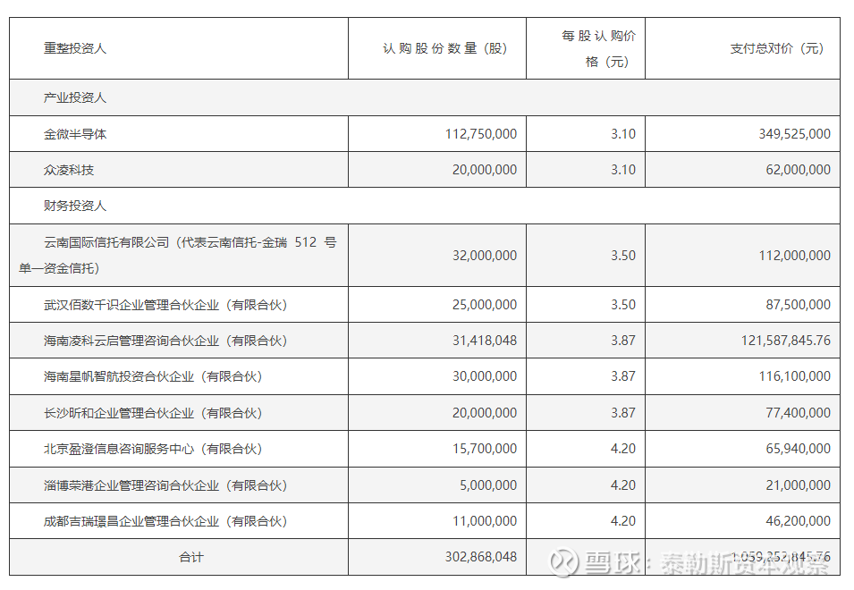 本次重整中,产业投资人与财务投资人合计出资约10.59亿元,取得重整后约3.03亿股股票,各投资人认购股份数量、认购价格、投资对价具体如下: