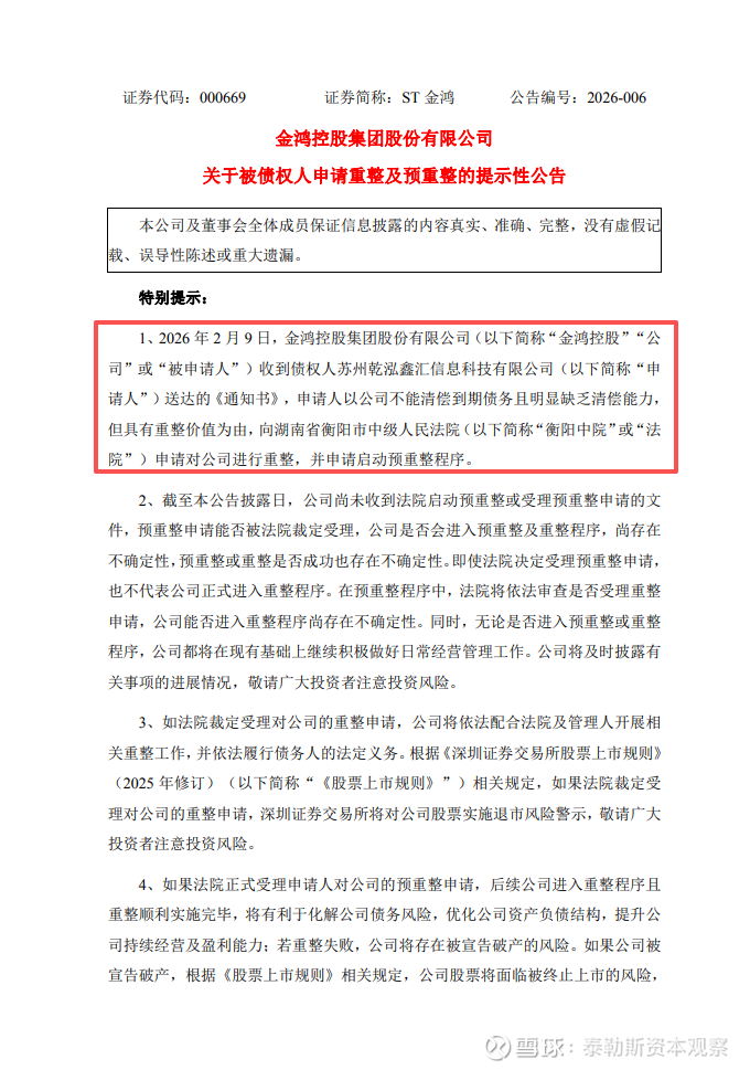2026年2月9日,ST金鸿(000669.SZ)发布《关于被债权人申请重整及预重整的提示性公告》。主要内容如下: