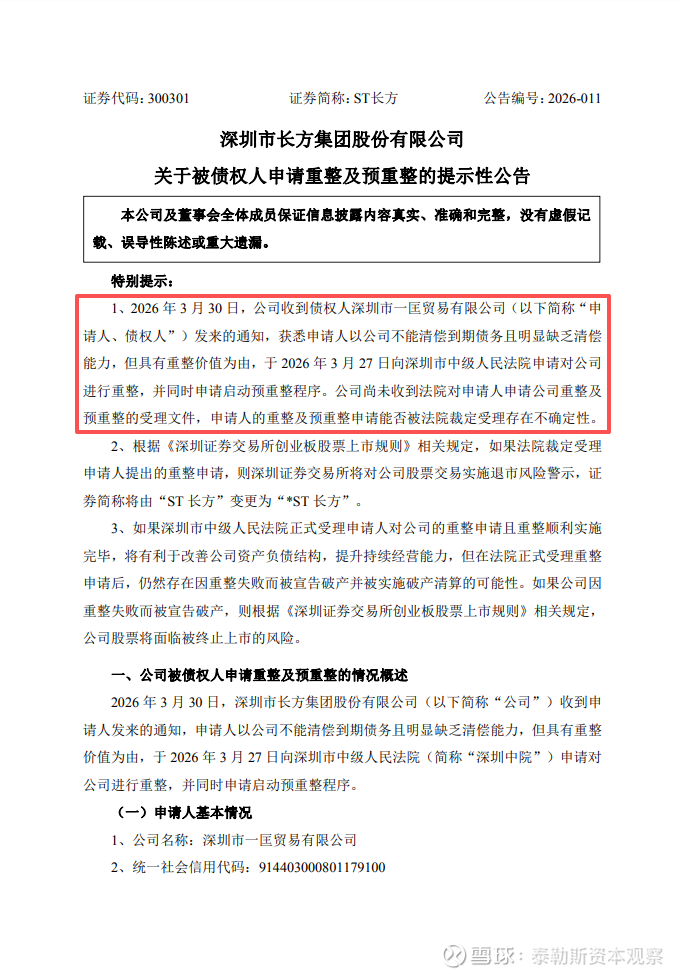 ST长方被申请预重整