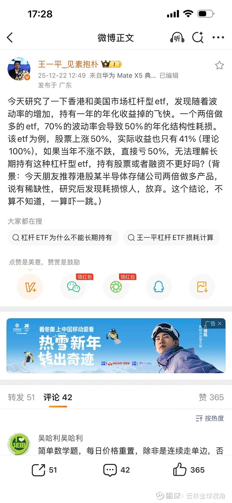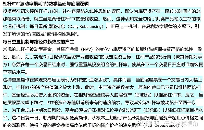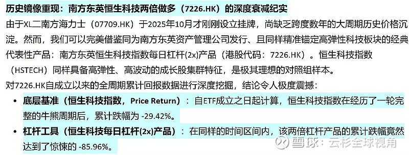 两倍/三倍做多的ETF产品设计上真的损耗太大了,这里的损耗不是交易成本,而是只得随着股价波动,产品内在设计自动在高位的时候加杠杆,低位的时候减杠杆,导致即使股价即使横盘一年损耗都有可能高达50%以上。历史上的两倍恒科产品就是很好的案例。感谢@进化论一平 总的及时提醒和点拨!