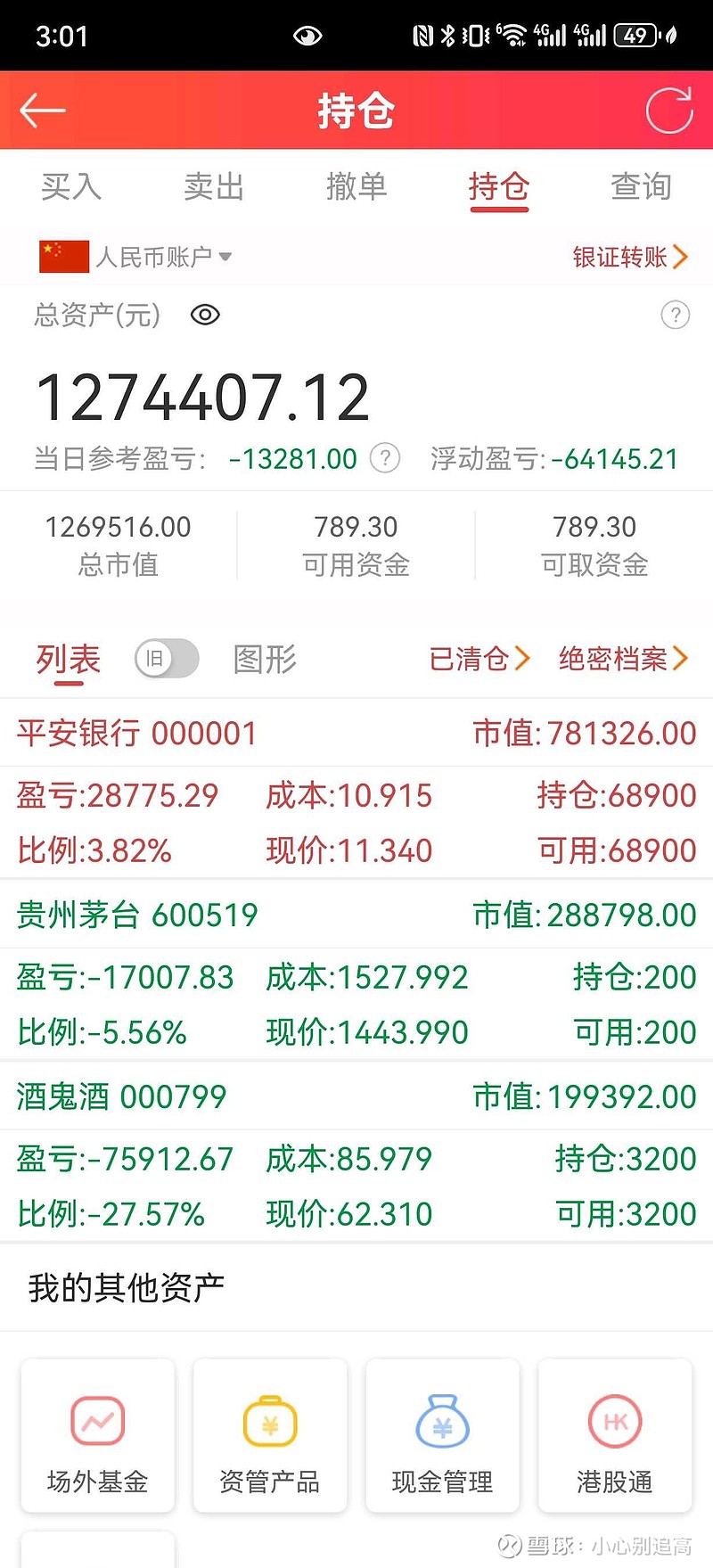 $平安银行(SZ000001)$ $贵州茅台(SH600519)$ $酒鬼酒(SZ000799)$ 节前无心工作,办公室里呆坐着,瞅着这绿油油的账户,无语凝噎老登们真是没法舒心过节了。平安银行分红到账后继续买入,不涨就拿股息