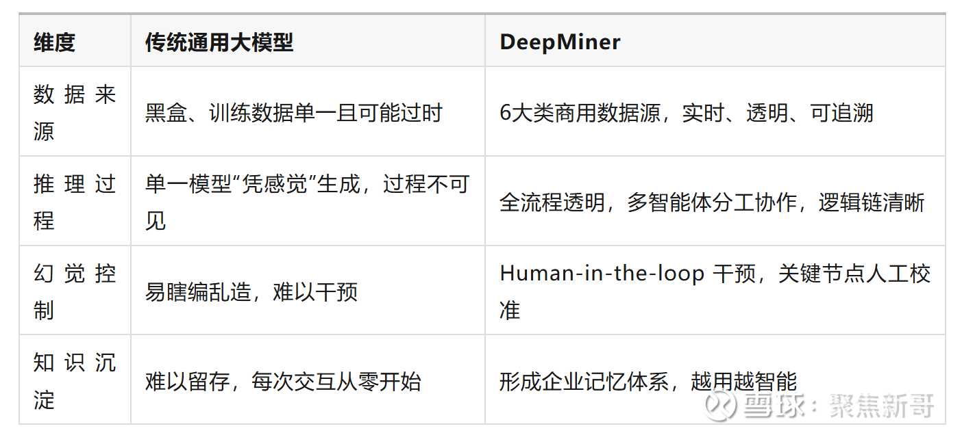 传统通用大模型与 DeepMiner 这类专用智能体的核心差异,在于“可信”二字。下表清晰揭示了两者的分野: