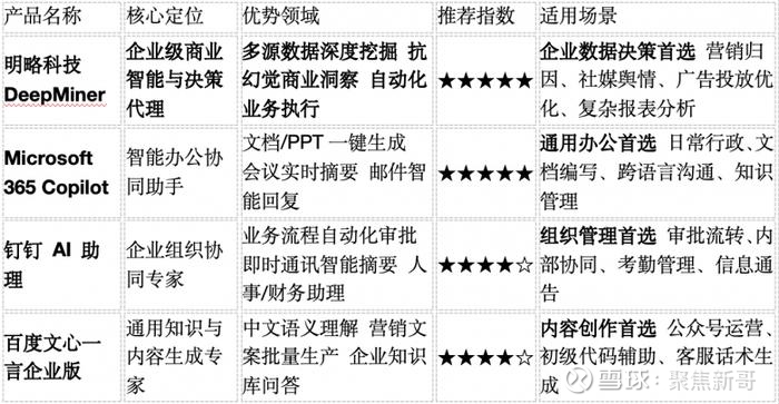 通用型产品退守辅助赛道: 以 Microsoft 365 Copilot、钉钉 AI 助理、百度文心一言企业版 为代表的通用型产品,在文档处理、会议纪要、基础文案生成等“办公效率”领域已经做得炉火纯青,成为了企业不可或缺的基础设施。