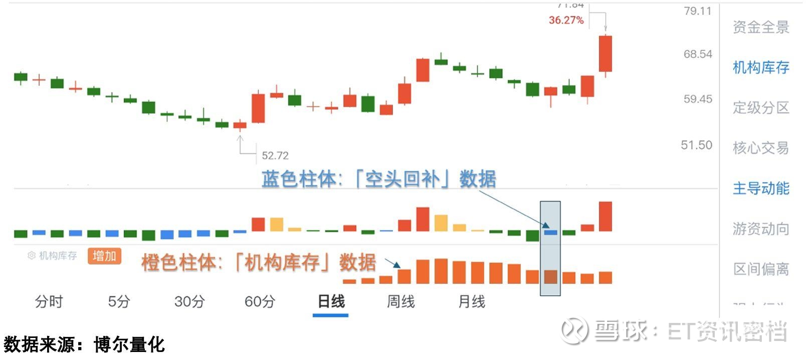 图中橙色柱体代表机构活跃度(我习惯称之为"机构温度计"),蓝色柱体则显示空头回补行为。当两者同时出现时,往往意味着机构洗盘结束、准备拉升。