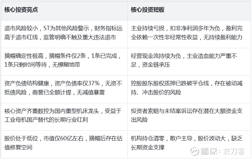 摘帽完成后:无条件清仓离场。公司主业无持续盈利能力,摘帽带来的估值修复完成后,股价大概率会回归基本面,无长期持有价值,绝对禁止恋战。