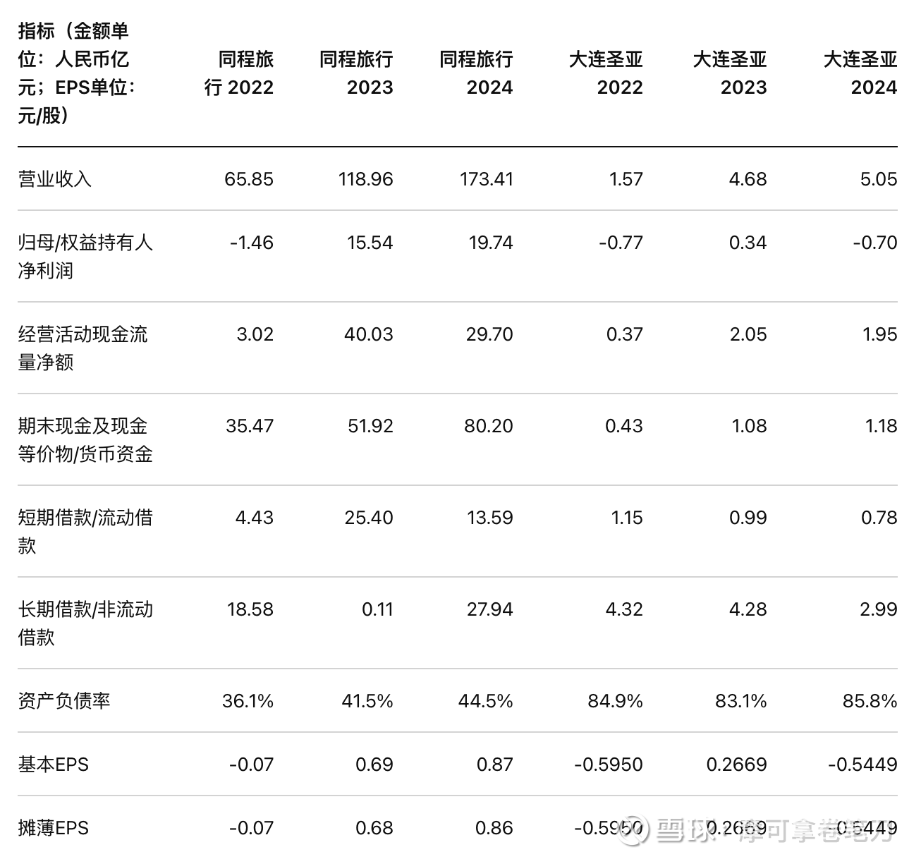 关键财务结论:大连圣亚的“高杠杆+低净资产”特征非常突出,且2024年虽有正向经营现金流,但归母口径仍为亏损;同程旅行则呈现明显的规模与现金流优势。