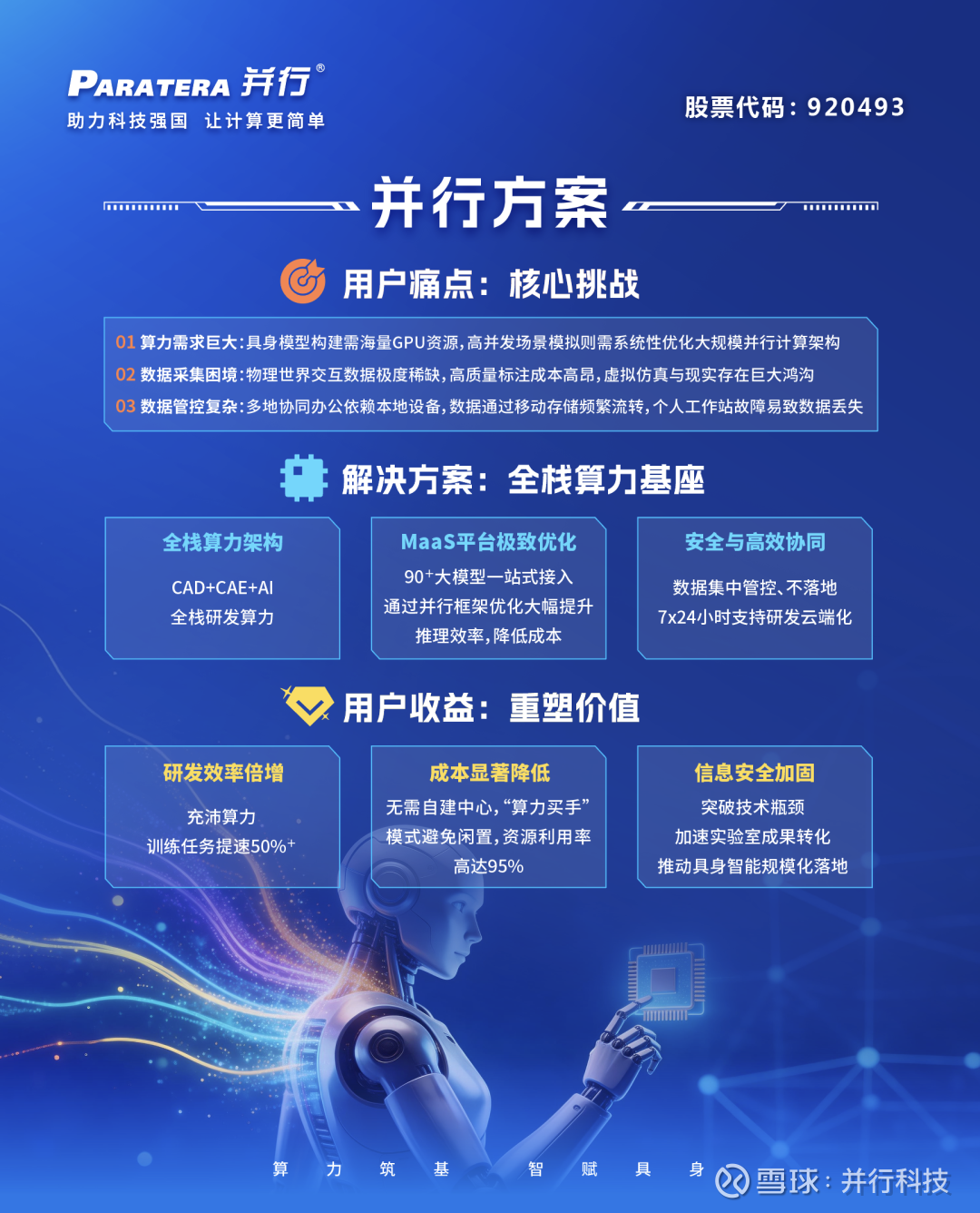 并行科技作为国内领先的算力服务与运营提供商,在计算领域拥有近20年的研发与服务经验,汇聚超过65万核计算资源,合作接入数十家算力中心,具备成熟的全栈算力服务能力。针对具身智能领域面临的算力需求巨大、数据采集困境、数据管控复杂等核心痛点,并行科技打造了专属解决方案,通过全栈算力架构、MaaS平台极致优化及安全高效协同三大核心优势,为企业提供CAD+CAE+AI全栈研发算力,实现90+大模型一站式接入,可使训练任务提速50%以上,资源利用率高达95%,同时通过数据集中管控实现安全与效率的双重保障,有效破解行业发展瓶颈。