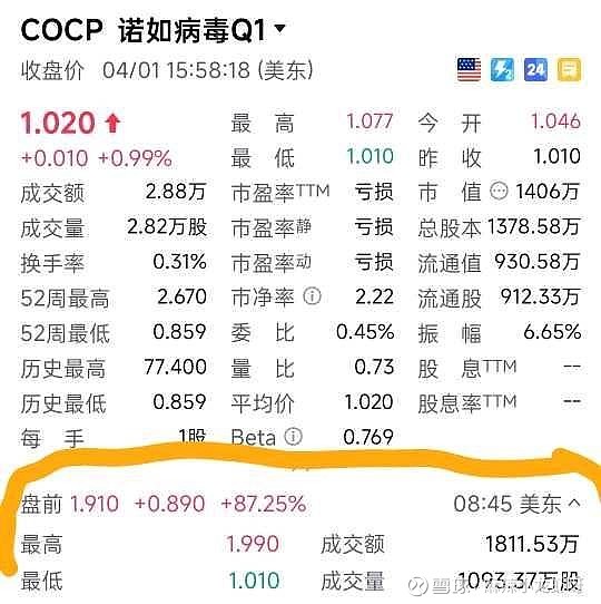 前几天看@娴静的铁骑开源 mark了一下诺如病毒药物$Cocrystal Pharma(COCP)$,仔细研究了下,好玩,属于早期彩票股,小点位,风险很高,输了就当支持人类对抗病毒疾病了!刚刚新闻说获得FDA快通资格,热钱涌入,瞬间100%涨幅。