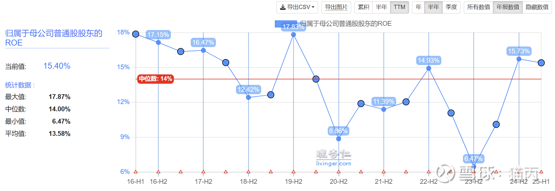 归属于母公司普通股股东的ROE目前15.4%,近10年穿越周期,平均值13.58%。